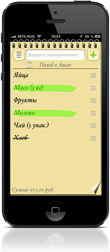 Перед Вами удобное и простое приложение для Вашего телефона, позволяющее легко и быстро создавать список необходимых покупок. Вам часто приходится составлять список вещей, которые необходимо купить? Тогда это приложение сделано специально для Вас. Важные покупки можно выделить из общего списка. Вычеркивание покупки происходит одним касанием. Список покупок можно переслать на другой телефон. Надеемся, что данное приложение украсит Ваш телефон и облегчит поход по магазинам.